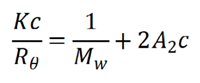 where c is the concentration of the sample, θ is the angle of detection, Rθ is the Rayleigh ratio (used to characterize the intensity ratio between the incident light and the scattered light at angle θ), A2 is the second virial coefficient, K is a constant associated with (dn/dc)2.