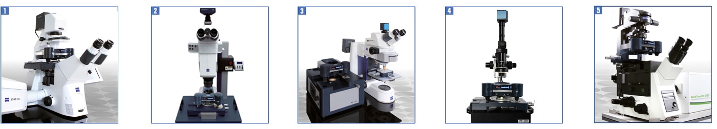 NanoWizard® 4 XP setups on Zeiss LSM 880 confocal microscope with Airyscan (1), with Upright Fluorescence Microscope (UFM) Kit for tissues or other large samples such as organs (2), with BioMAT Workstation for high NA optics and Zeiss Axio Imager (3), with TopviewOptics (4) and on Olympus with PicoQuant MicroTime 200 STED (5).
