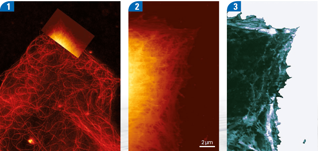 The images show a STED and AFM experiment of living A549 cells imaged at 37 °C in medium. (1) STED image of microtubules labeled with silicon rhodamine overlaid with AFM topography. (2) AFM QI topography image at 240 pN imaging force (height range 3.5 μm). (3) Corresponding QI Young’s modulus image (z range 100 kPa).