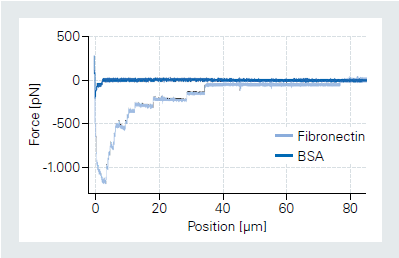 Single-cell force spectroscopy measurements using the CellHesion module with an increased z range of 100 µm, showing the detachment force curves of a single A549 cell from fibronectin (FN) and from bovine serum albumin (BSA) coated culture dishes. Note that the detachment of the cell from fibronectin results in a very large pulling range of 77 µm.