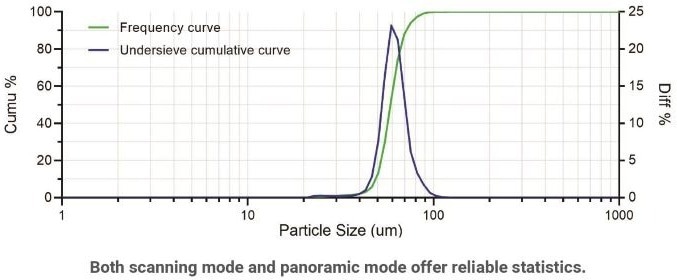 When compared to manual testing, this automatic scanning process offers greater efficiency as it performs the image capturing and stage moving processes simultaneously. This scanning mode can also analyze a large number of particles in one test, giving added weight to the statistical significance of the results.
