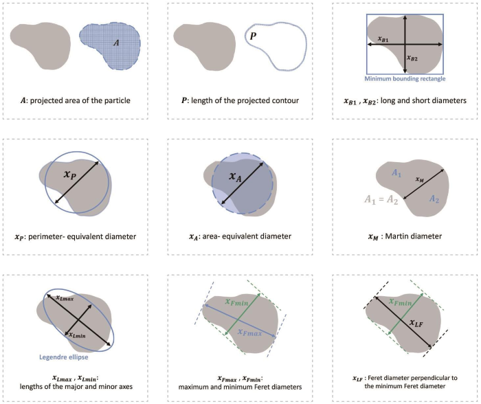 - Equivalent diameters; for example, perimeter-equivalent diameter, and area-equivalent diameter