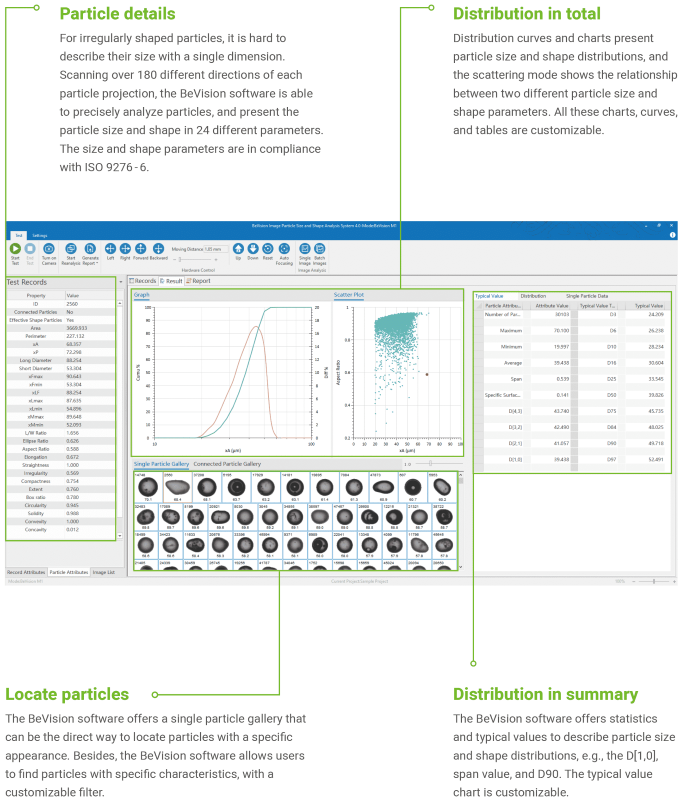 Panoramas obtained by utilizing the BeVision M1 will record all particles dispersed in a region at the millimeter level and will retain their shape details. Clear panoramas assist in the accurate counting of particles in the macro-region. They also allow for the analysis of the shape and size of particles without any leftovers.