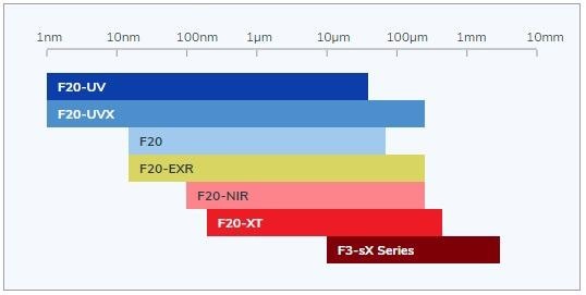 The F20 configuration is typically determined for a specific film thickness range, from the F20-UV and F20-UVX measuring films as thin as 1nm, to the F3-sX measuring films up to 3mm thick.