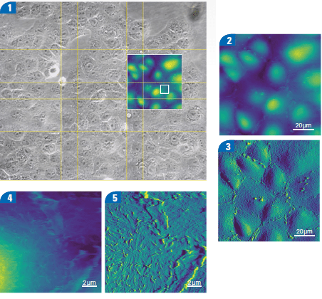 The images show living Vero cells in cell culture medium at 37 °C in PetriDishHeater™. (1) Optical tiling with 5 × 6 phase contrast images covering a 630 µm × 450 µm region. (2–5) Zoom into region scanned with AFM showing 100 μm × 100 μm scan (height range 5 μm) and inset 15 μm × 15 μm (height range 2 μm) scan topography images using PeakForce Tapping®. The feedback correction signal images highlight the surface membrane features, particularly in the zoomed image. Microvilli dominate the center of the cell, with membrane ruffles at the cell boundary.